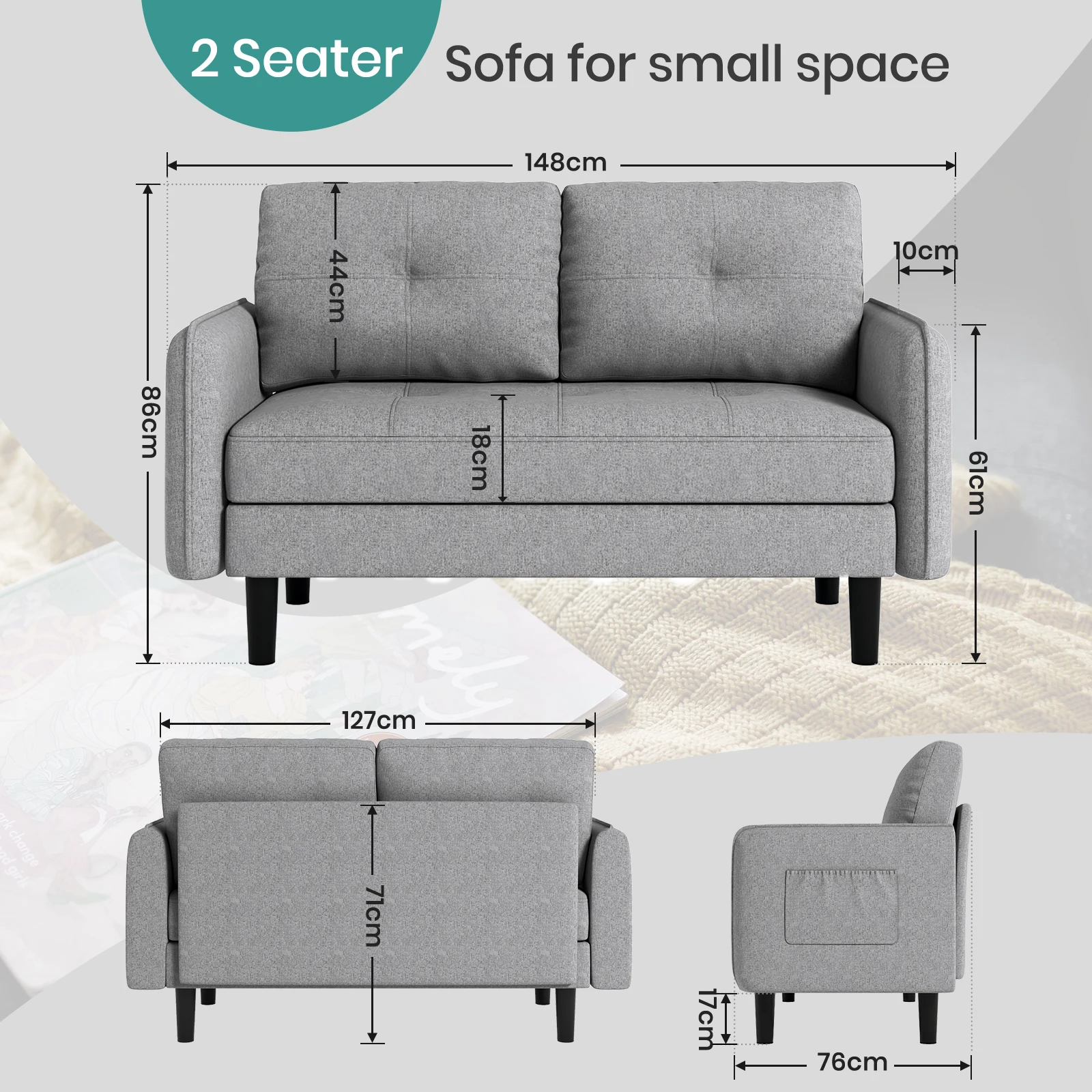 2 Seater Sofa, Fabric Comfy Sofa Couch Loveseat with Pocket Storage, Small Sofas for Living Room, Bedroom