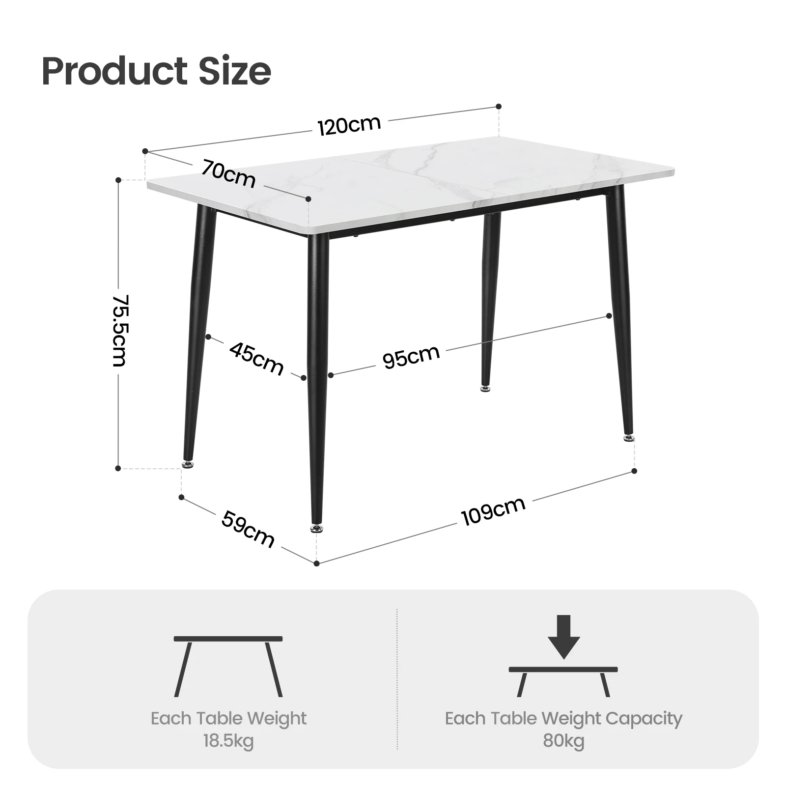 Features a robust powder-coated steel base for stability, supporting up to 80kg.Measuring 120cm (L) x 70cm (W) x 75.5cm (H), the compact design fits seamlessly into small apartments, breakfast nooks, or modern offices.