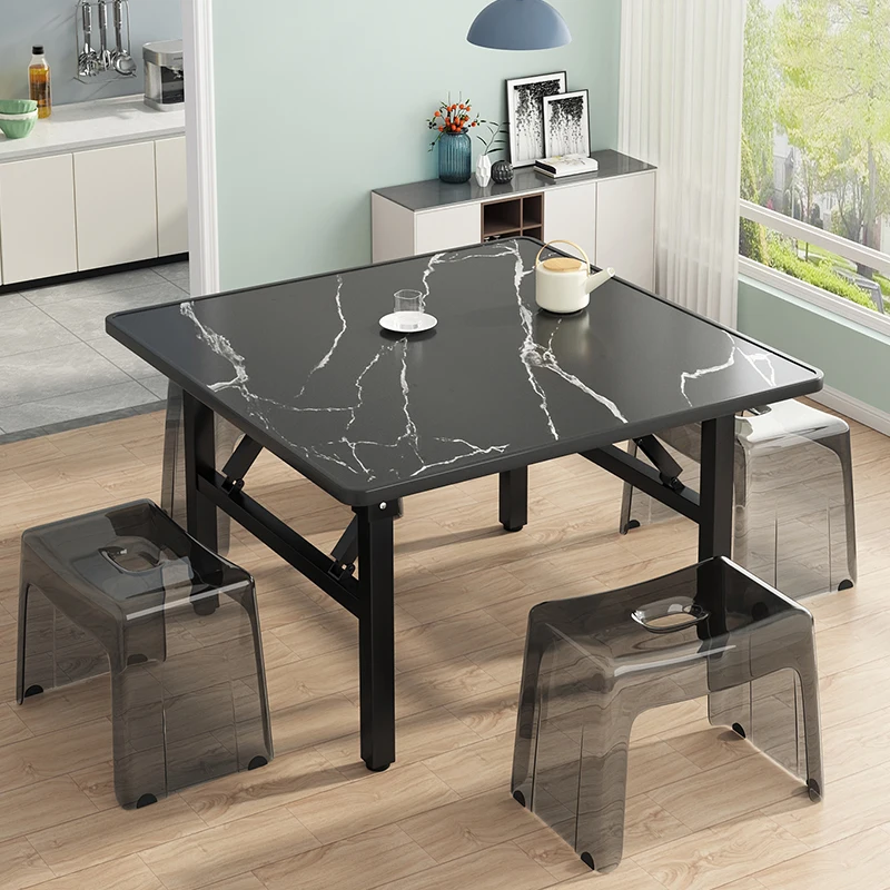 Premium Black Marble Texture Square Folding Coffee Table, Kitchen Dining Table with Metal Frame